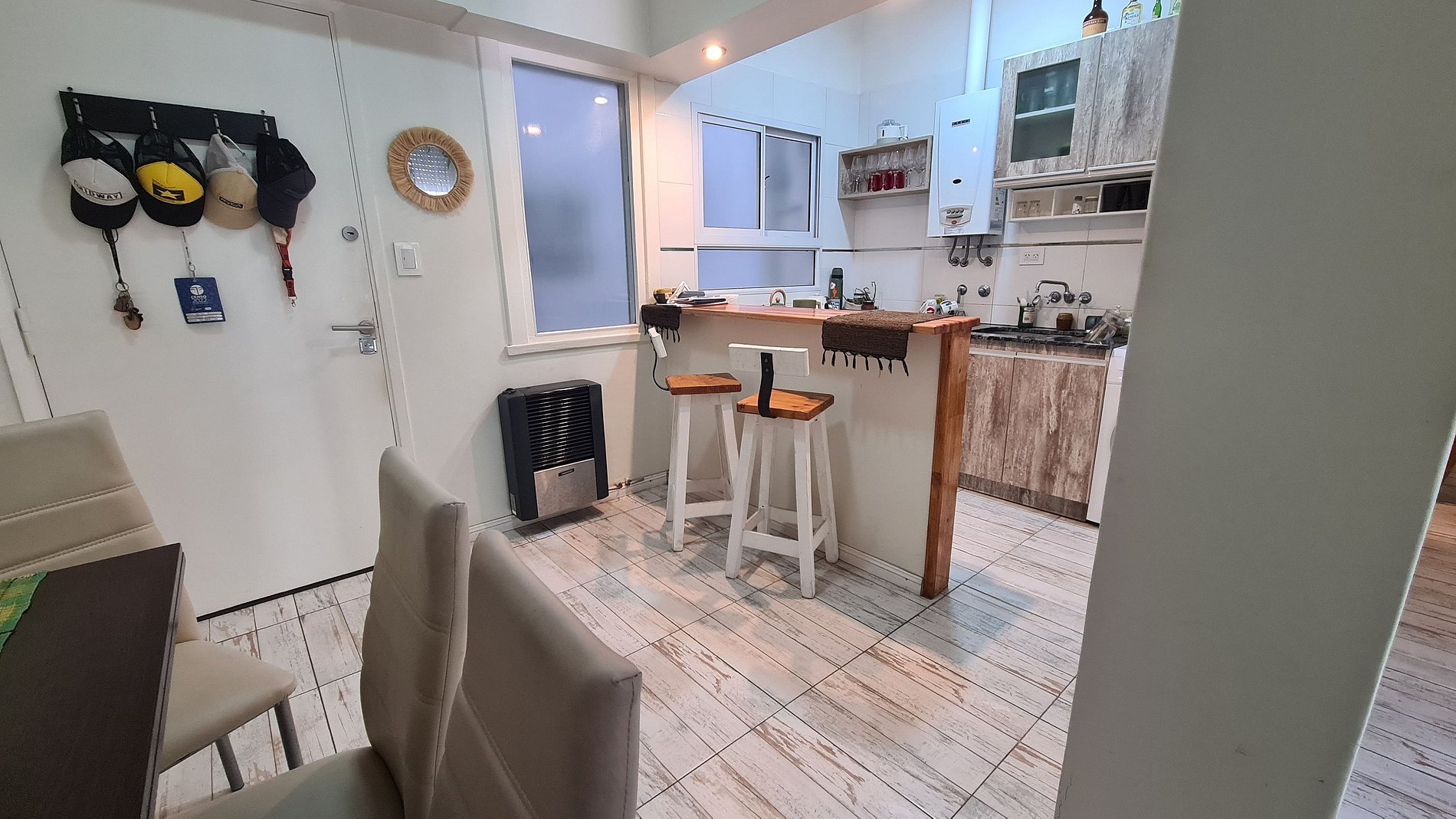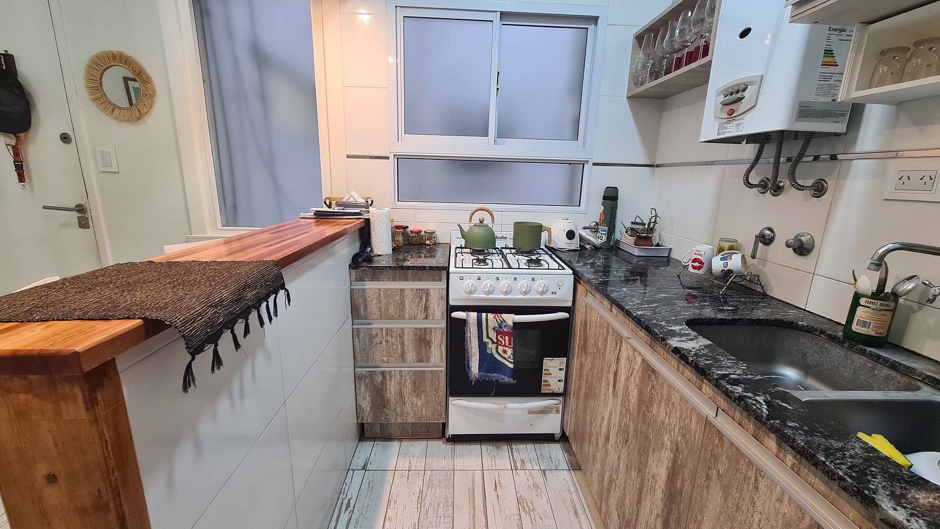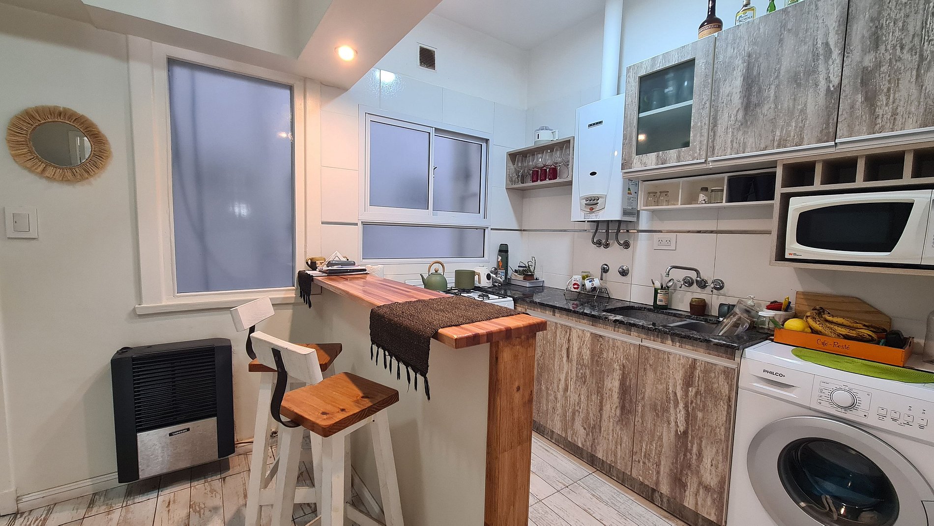 El ingreso es a la cocina integrada con barra desayunadora, continuando al living comedor con salida al balcon, el dormitorio cuenta con una cama matrimonial y placard empotrado, el baño es completo con bañera
