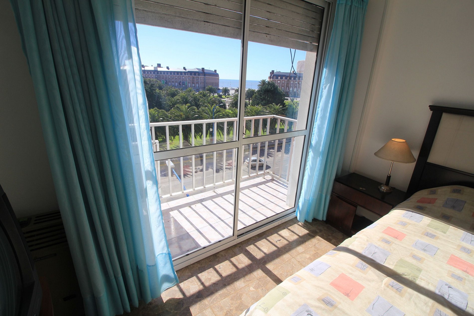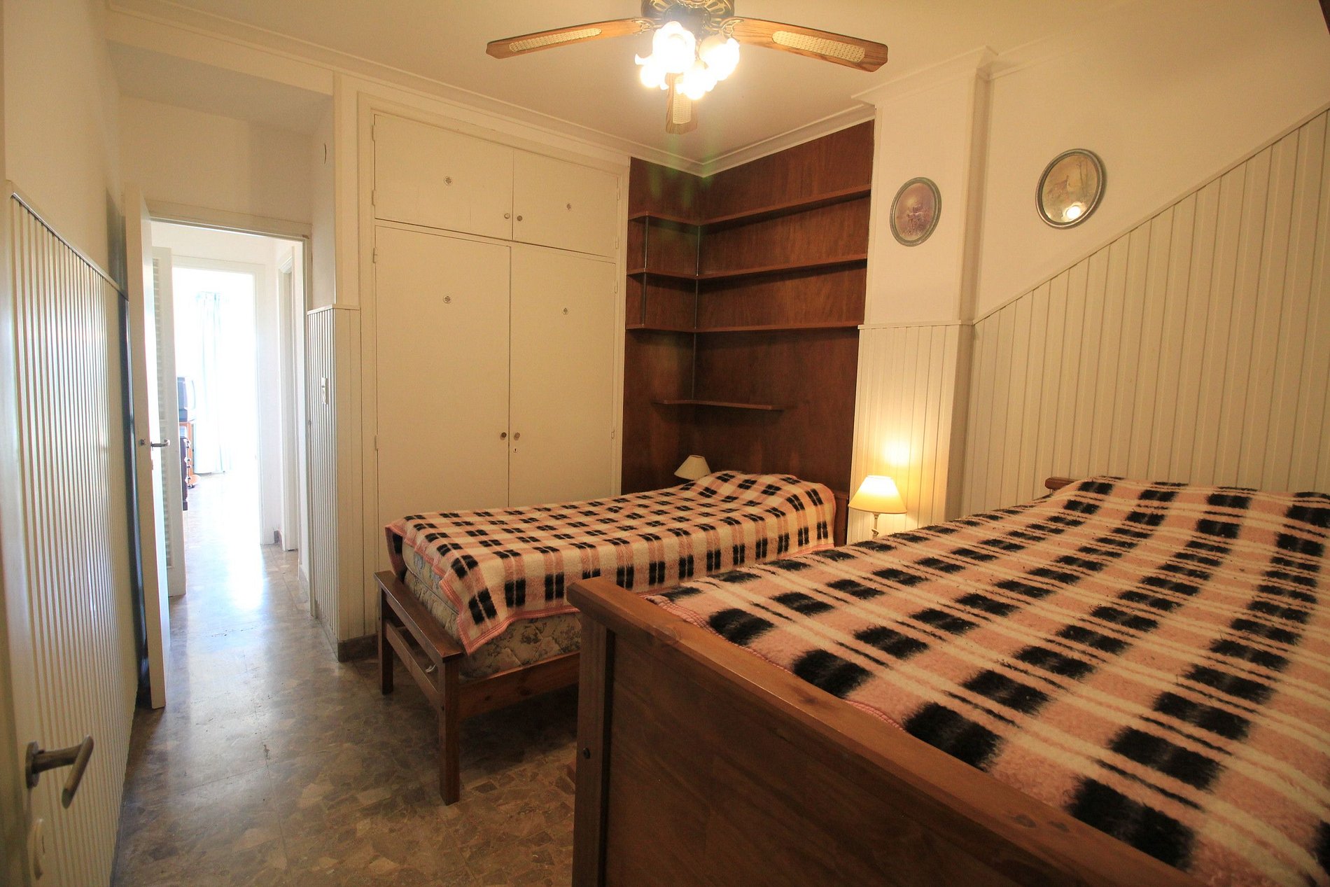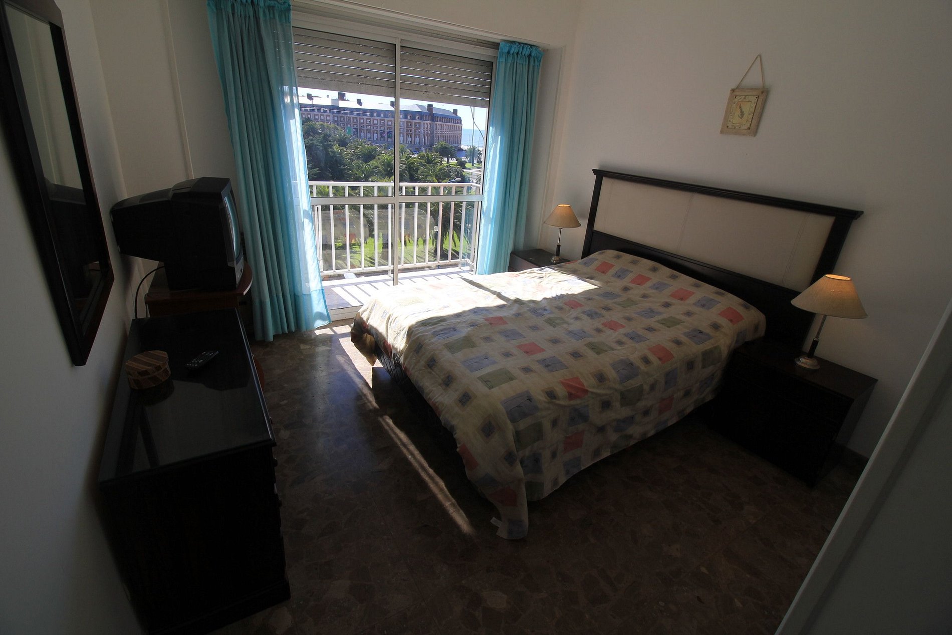 Departamento de tres ambientes con dependencias de servicio, con balcón saliente y vista a la Avenida Colon y a la plaza Colon. Living comedor con balcon frances. Dos dormitorios uno de ellos tiene un somier de dos plazas, al contra frente. Segundo dormitorio cama cucheta y una cama de una plaza. En la dependencia de servicio tiene una cama individual.